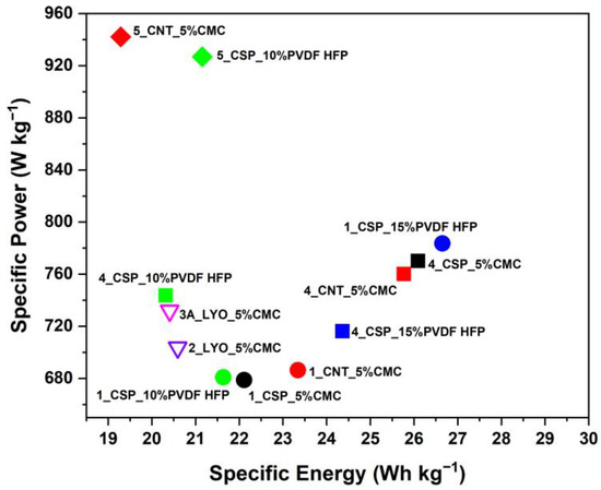 Figure 9 shows the specific energy versus power for selected electrodes at a current density of 1 A g−1. Overall, as before, spray-coated electrodes performed better than freeze-casted electrodes. Depending upon the thickness, there was a large variation in the specific power of the electrodes. The thickest electrodes outperformed the thin electrodes, as they had the highest specific power, at 942 W kg−1.