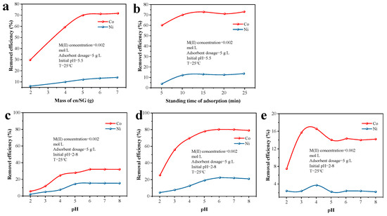A batch process was employed for the sorption of the Ni(II) and Co(II) salt solutions on the surface of SG and en/SG to evaluate its adsorptive characteristics in aqueous media at room temperature. Under normal experimental conditions, the concentration of metal ions in the solution was described according to the experimental steps. The pH of the solution was controlled to 5.5, and the adsorption was static for 40 min, unless otherwise specified. Table 1 and Figure 3 show the results of the sorption of Co(II) and Ni(II) by SG and en/SG under different conditions and the comparison of the separation factors. It can be seen from Figure 3a,b that the reaction has reached equilibrium when the addition amount of en/SG is 5 g and the standing time is 10 min. According to Figure 3c,d, aqueous pH (range 2–6) has an important effect on adsorptive uptake of metal ions. The experimental results show that the removal rate of metal ions increases with increasing pH value in the range of 2–6. A plausible explanation is that the hydrogen ions in the solution have a great influence on the active sites on the surface of the adsorbent. At lower pH values, with the increase of hydrogen ion concentration, the competition with metal ions on the binding site of the adsorbent is stronger, which reduces the adsorption capacity of metal ions. At higher pH values, the presence of hydrogen ions in the solution is reduced, and the surface of the adsorbent is also deprotonated, increasing the adsorption of metal ions. Compared to Figure 3c,d, it can be seen that after modification with ethylenediamine (en/SG), the SG removal efficiency for nickel and cobalt is significantly increased. In addition, the separation factor is defined as the ratio of ηCo to ηNi. The results show that en/SG has a higher separation performance compared to SG (Figure 3e).