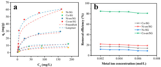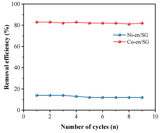 Besides, the adsorption isotherm can effectively reflect the adsorption capacity of the material to metal ions and is fitted by the Langmuir model and Freundlich model. The adsorption isotherms of SG and en/SG for metal ions are shown in Figure 6. Comparing the correlation coefficient (R2), the adsorption process of nickel and cobalt on SG material is more in line with the Freundlich model, while the sorption process of en/SG material is more in line with the Langmuir model. Therefore, the sorption of metal ions by en/SG materials is monolayer adsorption, which satisfies the chemical adsorption process, while the adsorption of SG conforms to the multi-layer adsorption process. Generally, the concentration of metal ions in the solution will affect the adsorption efficiency. In order to explore the effect of the initial solution concentration on adsorption performance, the initial solution concentration was changed. The results showed that en/SG could still maintain a good adsorption efficiency with the increase in metal ion concentration (Figure 6b). The regeneration capability of en/SG was evaluated by cyclic sorption tests. The metal ions were eluted from the adsorbent by configuring a certain concentration of hydrochloric acid solution. As depicted in Figure 7, the Co(II) removal efficiency exceeded 80.0% after 9 cycles of reuse, and the removal rate of Ni(II) also remained almost unchanged. It can be inferred that the en/SG showed excellent reusability within an expected lifetime that allowed for its long-term use.