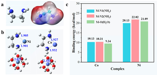 (a) Structure of ethylenediamine and its molecular electrostatic potential (ESP) map observed from the vertical direction. (b) Bond length between M2+ and ethylenediamine. (c) The binding energy of M-N and M-O.