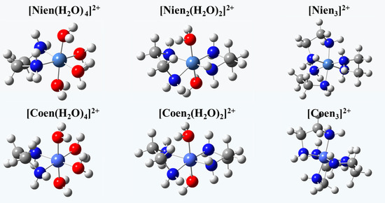 As mentioned above, ethylenediamine can replace the coordination water molecules around metal ions, but its coordination number is still unclear. In order to solve this problem, all possible species formed by the coordination of ethylenediamine with metal ions are considered. In the initial solution, nickel and cobalt ions exist in the form of Ni(H2O)62+ and Co(H2O)62+ in a sulfuric acid aqueous solution, respectively [41,42,43]. Since ethylenediamine forms a bidentate ligand with metal ions, three species may be formed when ethylenediamine replaces the coordinated water molecules of nickel or cobalt ions, namely [M(en)(H2O)4]2+, [M(en)2(H2O)2]2+, and [M(en)3]2+. The molecular structures of these species are optimized at the B3LYP/6-31G* level (Figure 9).
