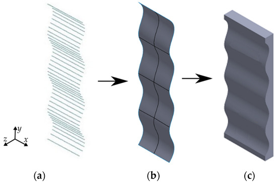 CLOUD_A is exported and saved in a .txt file with the format “text delimited by tabs”. Then it is used as input in SolidWorks® (v2019, Dassault Systèmes, Waltham, MA, USA). Within this CAD software, the feature of ScanTo3D is used. This enables importing the CLOUD_A from the .txt file. After the .txt file is uploaded (Figure 3a), a surface mesh is created (Figure 3b). Then, an extrusion operation is used to create a solid model like the one shown in Figure 3c.