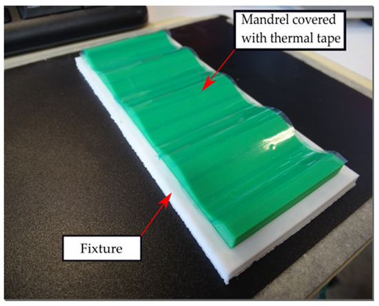 Before the fabrication of the lattice samples, a fixture is printed. This fixture is a rectangular frame that keeps the mandrel in position while other manufacturing operations occur. Since the mandrel and the lattice are printed in the same material and printing parameters, the surface of the mandrel is covered with a thermal tape Mecolour® (sublimation blanks consumables, Shanghai, China) to prevent the lattice adhesion to the mandrel and facilitate the removal process, as shown in Figure 4.