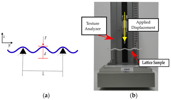 The mechanical properties of the lattice samples are characterized through three-point bending tests with the boundary conditions shown in Figure 6a (d = 30 mm and L = 66.5 mm) on a TVT 6700 Perten Texture Analyzer (Perten Instruments, New South Wales, Australia). The machine setup is presented in Figure 6b, showing a curved-lattice sample during testing. The machine was set in displacement control mode setting a maximum displacement of 30 mm at 0.5 mm/s. All variations of the design were tested on five replicas. The data for the load (F) and displacement (d) was then exported and further processed in MATLAB®. All the data for stiffness processed from the three-point bending characterization is included as the mean value along with their corresponding standard deviation.