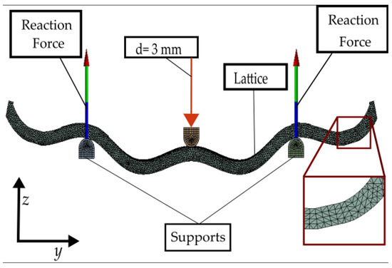 Cartesian coordinates included in CLOUD_B are used as inputs for a script (macro) made in VisualBasic® Language and run in the SolidWorks® environment. This macro generates a 3D sketch containing all the points at the locations to generate the curved lattice via a swept operation. The computational model developed is then imported to finite element analysis (FEA) software AnsysWorkbench® (Canonsburg, PA, USA), where the applied boundary conditions are shown in Figure 6a. Two types of material properties were used: PLA for lattice models with a Young’s modulus of 3.5 GPa and a Poisson’s ratio of 0.3, and structural steel for supports and loading add-in components, with Young’s modulus of 200 GPa and a Poisson’s ratio of 0.3. The mesh is based on tetrahedral elements with an element size of all bodies (lattice, pusher, and supports) of 1 mm. All simulations are run with a vertical displacement of 3 mm applied, as this displacement is within the linear region of the load-displacement curves in all the experimental measurements. The reaction forces were obtained at the supports. The type of contact between the lattice structure and the supports is frictional with a friction coefficient of 0.2; the type of contact between the pusher and the lattice is bonded because the pusher is in contact with the sample at the same point in every moment of the simulation. Both a deformed shape and the loading conditions in the ANSYS® setup can be observed in Figure 7.
