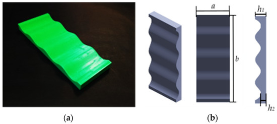 The fabricated mandrel with dimensions of a = 50, b = 130, h1 = 10, and h2 = 5 is shown in Figure 8 (all in millimeters). In CLFFF and FFF, four different volume fractions () were printed. For each of these, two raster arrangements were tested (square and diagonal). In Figure 9, Figure 10, Figure 11 and Figure 12, all the lattices designed following the procedure described in Section 2.1 are presented. Samples in Figure 9, Figure 10, Figure 11 and Figure 12 are arranged according to their raster arrangement (square or diagonal), volume fraction, and their fabrication method (CLFFF or FFF). In Figure 9, Figure 10, Figure 11 and Figure 12, from left to right, the CAD model, the extruder trajectory simulation, and the manufactured sample are presented.