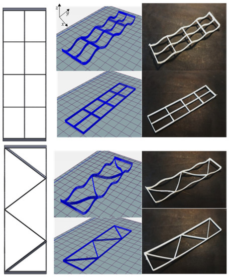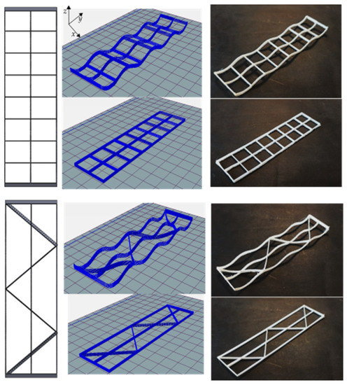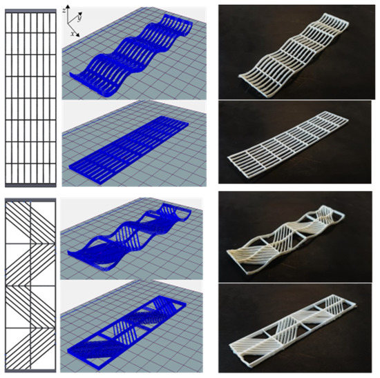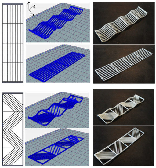 In general, experimental and numerical data exhibited that lattice samples with a higher number of axial rasters are stiffer. Volume fraction also affects the stiffness behavior, but only in cases where axial rasters are included. Take, for instance, the comparison between lattices with diagonal arrangements with The difference in volume fraction is only 0.01. However, the samples with are ~46% and ~76% stiffer in curved and flat lattices, respectively. Now consider samples with and again, the difference in volume fraction is only 0.01. Nevertheless, those structures with are ~30% stiffer. These differences in stiffness are the result of including an axial raster in the lattice structures. Such findings prompt the design of structures with tailored mechanical properties while aiming for a reduction of the amount of material used (minimal volume fraction increment 0.01) and notorious stiffening results (up to ~76% stiffer structures).