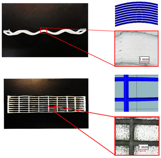 All samples were inspected in a magnified view and compared to the CAD. Expected results in terms of layering and material distribution were observed in the magnified view. This magnified inspection was then used to adjust the dimensions and geometry of the FEA models (Figure 13). Thickness variations in such samples could lead to deviations when compared with the FEA estimations. How these variations could affect the mechanical properties is further discussed in Section 3.2.1. and Section 3.2.2.