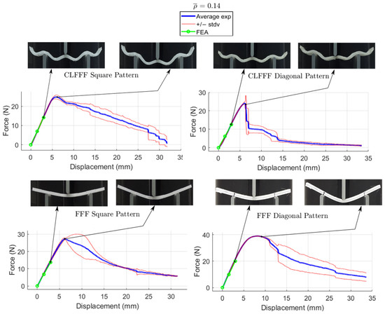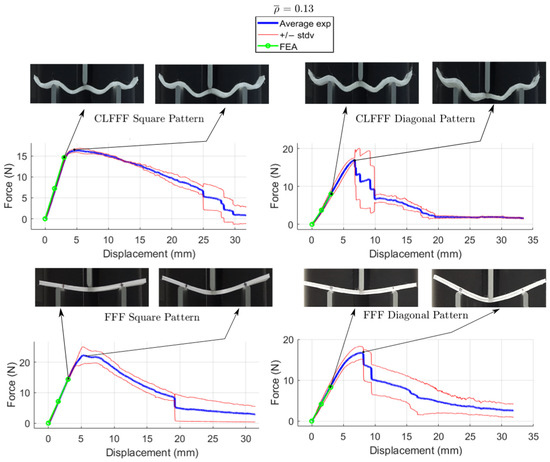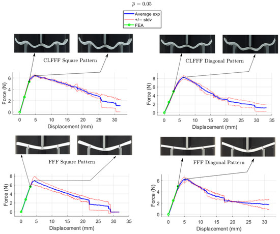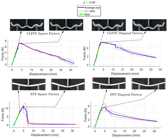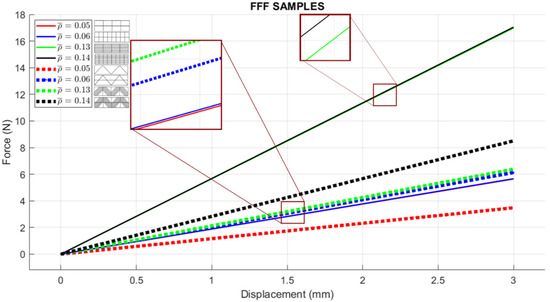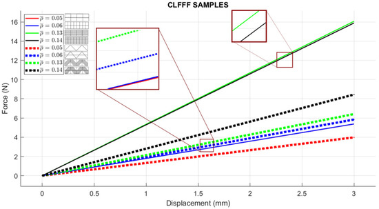 For CLFFF, the reaction force, when reaching a displacement of 3 mm, was compared in all experimental measurements. For all volume fractions of CLFFF, the square pattern samples present higher values from 10.9% up to 41.1% compared to diagonal patterns. On the other hand, in FFF samples, only for of 0.05, 0.06, and 0.13, the square patterns present higher reaction force values that range from 18.2% up to 40.4%. The only exceptions were the samples with , where the diagonal pattern presents a reaction force value 45.9% higher than the square pattern. The latter is attributed to the dimensions deviation obtained in additively manufactured samples when compared to the intended design. This was further corroborated when comparing the stiffness of these samples with ideal dimensions (Figure 14), where the samples that do not include diagonal rasters resulted in being stiffer for all configurations.