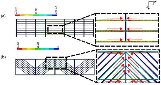 Von Mises stress distribution in (a) square and (b) diagonal pattern at 0.14 in FFF (units in MPa); red arrows indicate the rasters arrangements with higher influence on the stiffness.