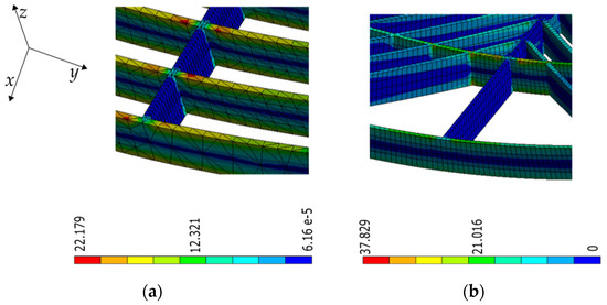 Stress distribution at the raster level resulted from finite element simulations of (a) square and (b) diagonal lattices in FFF samples (units in MPa).