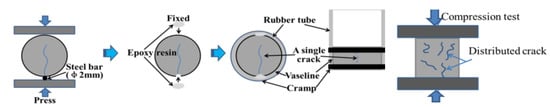 Figure 3 illustrates the schematic diagram of a single crack in a cylinder mortar specimen, which was produced through a split test with a loading rate of 100 N/s. Microcracks were created in the mortar using a steel bar while ensuring that the mortar remained intact. The cylinder mortar was then fixed with epoxy resin and a rubber tube to restrict the expansion of cracks during the self-healing process. To test the recovery of compressive strength, distributed microcracks were induced in the cubic mortar by preloading damage until the ultimate compressive strength was reached, and then the loading was immediately halted to maintain the integrity of the pre-damaged mortar.
