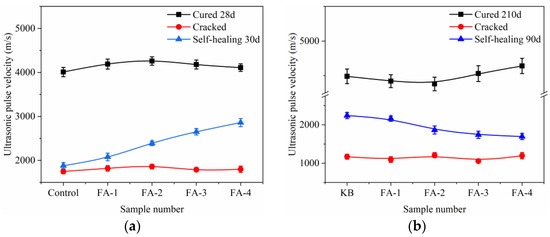 The ultrasonic pulse velocity (UPV) is a reliable method to assess the compaction and homogeneity of concrete [25,26]. The UPV value of concrete increases with its higher compaction and homogeneity. The impact of fly ash content on the UPV of cracked mortar specimens cured for 28 d (a) and 210 d (b) is presented in Figure 7. For uncracked mortar, the UPV values were high and followed a similar pattern as that of the strength. However, when the prefabricated crack was introduced, the UPV values dropped significantly [27], as indicated by the red line in Figure 7. After the self-healing process for 30 d, the UPV values of 28-day cured mortar increased with the addition of fly ash, indicating that FA improved the early age crack self-healing ability. Conversely, in the case of 210-day cured mortar, despite the 90-day self-healing in water, the addition of fly ash reduced the self-healing ability. The UPV values of the self-healed mortar were consistent with the closure of surface cracks.