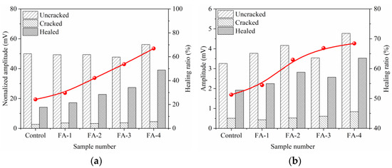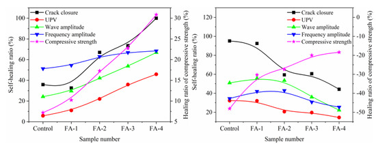 A transmission ultrasonic wave was used to characterize the seal-healing of cracks in the mortar. The healing rate characterized the healing effect better. Figure 8 and Figure 9 present the influence of FA on the healing ratio of maximum amplitude (UM) and frequency amplitude (UF) at 28 d and 210 d, respectively. The UM and UF healing ratios were calculated from Formulas (1) and (2), respectively.