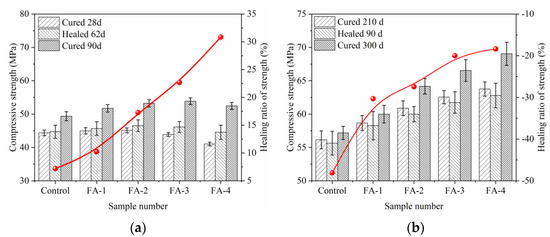 Effect of fly ash on strength recovery of cracked samples cured 28 d (a) and 210 d (b).