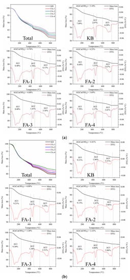 TG analysis of hydration products for samples cured for 28 d (a) and 210 d (b).