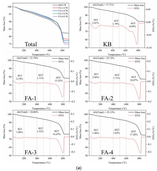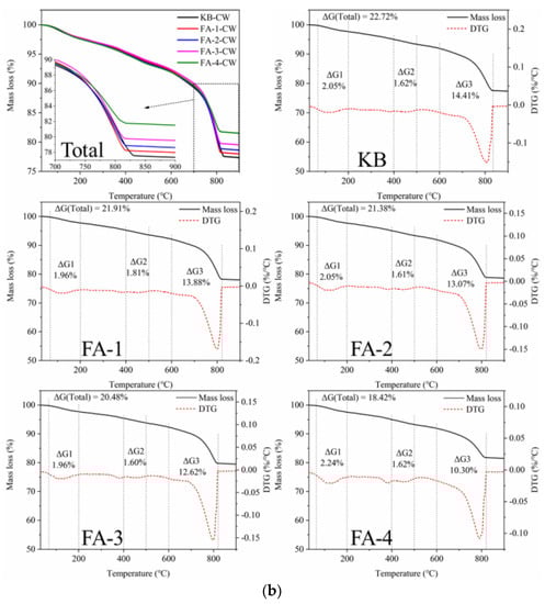 Figure 15 shows the TG analysis of self-healing products in cracks produced in samples cured for 28 d and 210 d. For self-healing products obtained from the mortar cured for 28 d, the TG curve shows that the significant weight loss peak is concentrated between 600 °C and 840 °C due to the decomposition of calcite. The CaCO3 content increased with the increase in fly ash, which expressed a reversed rule in the calcium hydroxide content of the crack surface before healing as the fly ash promoted the hydration of cement. The activated alumina and amorphous silica in the fly ash reacted with the calcium hydroxide, which consumed part of the calcium hydroxide and promoted the reaction of the unhydrated cement particles to produce calcium hydroxide. In addition, the increase in the calcium hydroxide content promoted the further hydration of fly ash in the later stage [2]. The calcium hydroxide content increased with fly ash increase. This was because part of the cement was replaced by fly ash, which diluted the cement and led to the actual higher w/c than that of the theory, which enhanced the further hydration degree of the cement and fly ash and increased the content of calcium hydroxide. Therefore, the continued hydration of cement released more calcium ions and increased the production amount of calcium carbonate during self-healing.