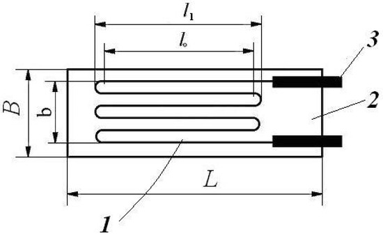 A bonded-wire strain gauge: —the total length of the gauge; —the total width of the gauge; —the wire serpentine’s active length, without the loops length; —the wire serpentine’s length; —the wire serpentine’s width; 1—the strain sensing element (here, a metal wire); 2—carrier element; 3—terminals for lead wire connections.