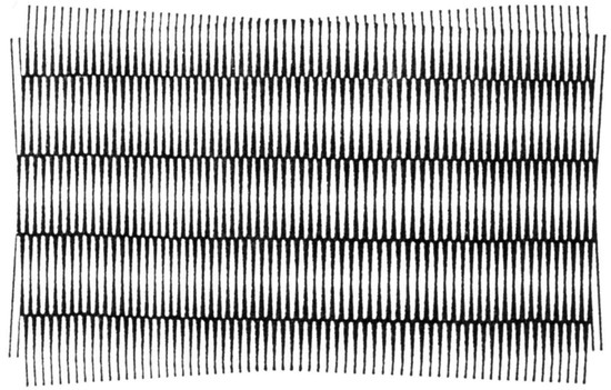 This method is based on the effect of superposing two similar grates (consisting of parallel, evenly spaced, opaque lines of constant width) that are slightly displaced relative to one another, in that so-called Moiré fringes are produced [7,14,15,16,17] (Figure 4).