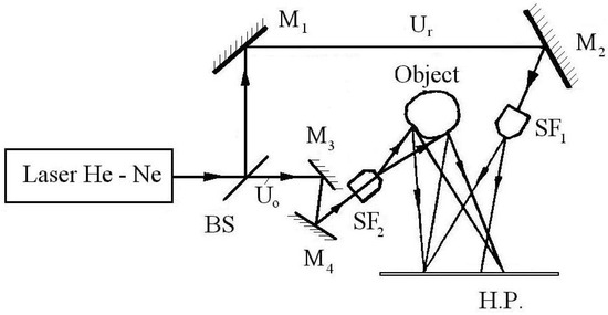 Figure 6 shows the optical principle of the transmission holograms. The monochromatic light beam emitted by a HeNe laser and divided into two parts by means of the beam splitter BS became a reflected part, named reference beam Ur, and a transmitted part, named object beam Uo. The reference beam guided by the mirrors M1, M2 passes through the spatial filter SF1 and arrives to the holographic plate HP. The object beam by means of mirrors M3, M4, and spatial filter SF2 arrives to the object. Due to the object’s surface irregularities, which act as secondary mirrors, the beam will be reflected to the holographic plate where it interferes with the reference beam. By their interference, one will obtain a virtual 3D image of the object’s visible surface, named a hologram. If one splits the exposure time into two parts—one for the unloaded state (or preloaded one) of the tested object and one other corresponding to the loaded state—by normal photo-processing, this will result in this type of virtual 3D image, i.e., hologram, where one can observe several interference fringes, which represent the geometric locus of the equally-displaced points of the object’s surface. The use of a relatively complex mathematical evaluation [20] finally results in the displacement field, as well as the corresponding strain field of the surface.