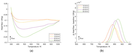 The difference between the smoothed DSC signal and the baseline and spline interpolations is displayed in Figure 2b. Obviously, the maximum temperature of the Cu4Sc precipitation shifts to higher values as the heating rate increases, implying that the precipitation reaction is thermally activated. Similar findings have been reported for recrystallization in cold-rolled pure copper [32], Cr clustering in equal-channel angular pressing (ECAP) processed CuCrZr [1], and recrystallization phenomena in Cu–Ni–Si alloy processed by high-pressure torsion (HPT) [33]. Due to the baseline shape extracted from the experiment, the determination of the 20 K/min curve using spline interpolation resulted in an exaggeratedly large area for the peak. At this point, manual adjustment of the baseline calculation parameters was necessary. Despite this adjustment, the peak temperature Tp remained unchanged, thereby keeping any potential impacts on the calculation of the activation energy unaffected. Comprehensive insights pertaining to the interpolated baselines are provided in Appendix A, Figure A1.