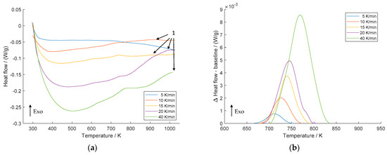 In addition, the curves show the peak of the second exothermic reaction (indicated by the number 1 with arrows), which can be attributed to recrystallization of the microstructure. This investigation agrees with the findings of Dölling et al. [31] obtained with a directly comparable experimental setup and raw materials.