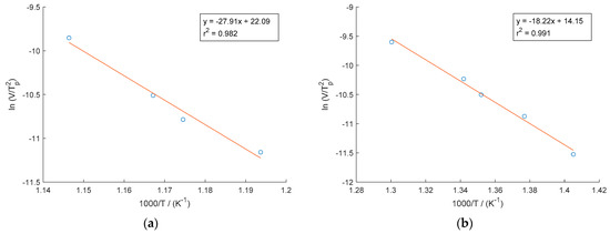 where V is the heating rate, Tp is the peak temperature, C is a constant, E is the apparent activation energy, and R is the molar gas constant. By plotting ln(V/Tp2) as a function of 1/Tp and fitting a linear regression line y to the data, the activation energy E can be calculated from the slope of the line using the relationship