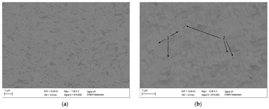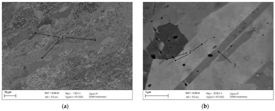 Changes in microstructure that occur during thermal treatment can be visually investigated by metallographic analysis. An SEM backscatter detector can be used to identify differences in chemical composition and distinguish between the phases of different elemental compositions [40]. The material contrast is determined by the atomic number of the elements. As the atomic number increases, the degree of backscattering increases as well, resulting in higher brightness in the SEM image of regions containing elements with higher atomic numbers. [41].