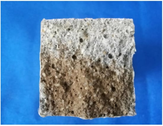 The sulfate resistance test was conducted according to Chapter 14 “sulfate resistance test” in GB/t50082-2009 “test methods for long term performance and durability of ordinary concrete”. The size of the test piece was 40 × 40 × 160 mm. The bottom surface of the test block was painted with protective coating as the test surface, and the other surfaces were sealed with epoxy resin sealant. The samples were soaked in 5% sodium sulfate solution and the test operated during a 28-day curing period. The samples were taken out from the curing room, and then their mass was measured as m0. The samples were soaked in sodium silicate solution until the set soaking period and then the mass of them was measured as m1 after wiped dry. The rate of mass change was calculated according to Equation (3). Finally, the strength of samples was measured and compared with that of the standard curing control group.