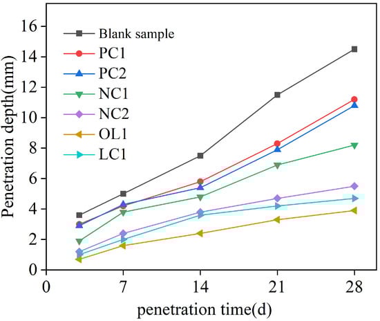 According to Fick’s second law of Equation (5), the main factors affecting chloride ion penetration were the compactness of mortar and chloride ion diffusion concentration (i.e., free chloride ion concentration in the mortar or cement-based materials). Figure 3 shows that PC1 and PC2 coatings could delay the penetration rate of free chloride ions in the mortar matrix. This is mainly due to the penetration of inorganic silicate components into the surface of the mortar matrix, having complex physical and chemical reactions with free calcium ions in cement-based materials to form hydrated calcium silicate (C-S-H) gel [], which improves the density of the surface of mortar matrix, thereby prolonging the permeation path of chloride ions, leading to a decrease in the chloride ion concentration gradient inside the mortar, and slowing down the diffusion rate of free chloride ions in the coated mortar samples. The nano- in nano-modified NC1 coating could play a synergistic role with silicate components, promoting hydration and generating more C-S-H gel, to further delay the diffusion rate of chloride ions. The penetration depth after 28 days of NC1 and NC2 coating treatment sample was reduced by 43.44% and 63.07%, respectively, compared with the blank sample, indicating a considerable improvement in the anti-chloride ion penetration ability. For the organic–inorganic modified OL1 and LC1 coatings, the penetration depth of chloride ions after 28 days is 73.03% and 63.83% lower than that in the blank group, demonstrating that both coatings have the greatest influence on the chloride penetration resistance of the mortar matrix. Moreover, more organic coatings could solve the problem of coating substrate cracking caused by uneven shrinkage, which makes them a very good engineering application prospect.