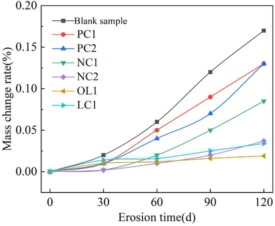 Figure 4 showed that under the condition of full immersion, the mass of the mortar sample presented an increasing trend. The blank group had the largest mass growth, and its rate of mass change was 0.17% after 120 days of sulfate immersion. PC1 and PC2 coating and nano-modified NC1 coating could effectively delay the invasion of sulfate and reduce the growth rate of mortar quality through reducing the porosity of the mortar surface and water [,]. However, the rate of mass growth of the samples treated with NC2, OL1 and LC1 coatings was very slow due to the dissolution of calcium hydroxide on the surface of the mortar matrix within 30 days of full immersion []. We can infer that the pores in the surface layer of the matrix provided a channel for the invasion of sulfate, which made sulfate gather in the pores and react with cement clinker mineral C3A and hydration product  to form ettringite and gypsum dihydrate, thus filling the capillary pores in the mortar, resulting in the increase of the strength of the matrix at the early stage of a sulfate attack. As shown in Figure 5, the strength of the blank group increased gradually between 0-60 days after sulfate attack, and decreased after 60 days of sulfate attack, while the strength of the coated sample increased slightly after sulfate attack. The strength of samples treated with PC1 and PC2 coatings began to decrease after 90–120 days of sulfate immersion, while the strength of samples treated with NC1 and NC2 nano-coatings and OL1 and LC1 coatings increased slowly within 120 days of immersion. The sulfate corrosion rate was slowed down by reducing the amount of sulfate entering into the mortar during the immersion period, and the corrosion reaction products failed to reach the critical amount of micro-cracks in the mortar. Among these coatings, the inorganic waterproof modified NC2 coating, organic–inorganic modified OL1 coating and LC1 coating have a great impact on the sulfate resistance of the mortar matrix.
