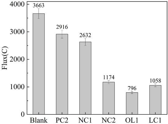 The evaluation standard of chloride ion permeability of concrete based on electric flux is present in Table 5 as ASTM C876-15 [], and the electric flux results of C30 concrete after coating treatment are shown in Figure 7.