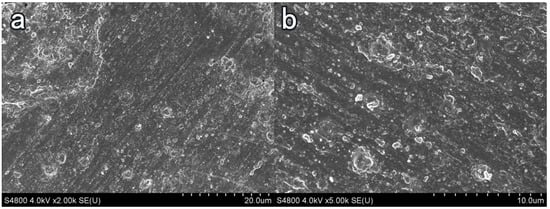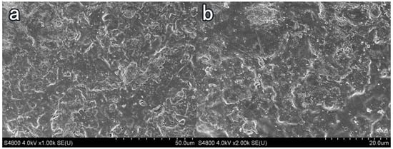 Surface treatment with NC2 coating. (a) ×2000, (b) ×5000.