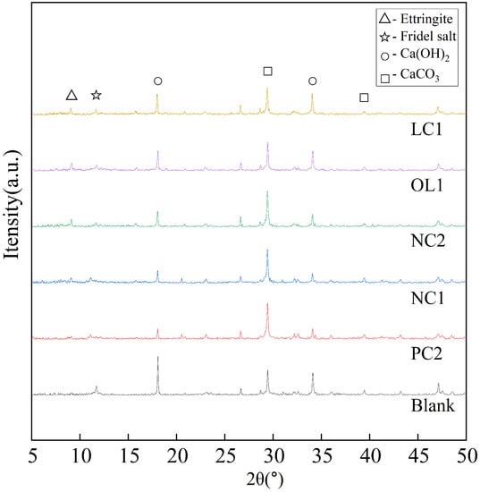 It can be seen from Figure 12 that the main phase groups of the blank sample are  and C-S-H gel.  is a layered crystal, easy to slip and weak in strength. In addition,  is easy to precipitate after external erosion, which is the weak link of concrete. After being treated with PC2, NC1 and NC2 coatings, the diffraction peaks of each  are weakened, while the diffraction peaks of C-S-H gel are significantly enhanced, which indicates that the coating components react with  in the hydration products of cement-based materials and form C-S-H gel, which plays an important role in the strength of the matrix. The nano- particles in the nano-modified coating can not only form aggregates to act as pore filler, but moreover, because of its nanocrystalline nucleus effect,  can gather on its surface, which makes it react more fully with silicate components in the coating and generate more C-S-H gel. However, the diffraction peak of  in the XRD spectra of OL1 and LC1 treated samples is relatively weak, and the content of C-S-H gel increases less than that of other coating-treated samples. It is not difficult to find out the reasons through analysis. In the organic–inorganic coating, some inorganic components are connected with organic components by silane coupling agents, which are mainly gathered on the surface of the substrate and chemically bond with the organic coating. To make it more stable and connect with the hydration products on the surface of the matrix, the remaining inorganic components can penetrate into the interior of the matrix, and react to play a role in filling the capillary pores in the matrix.