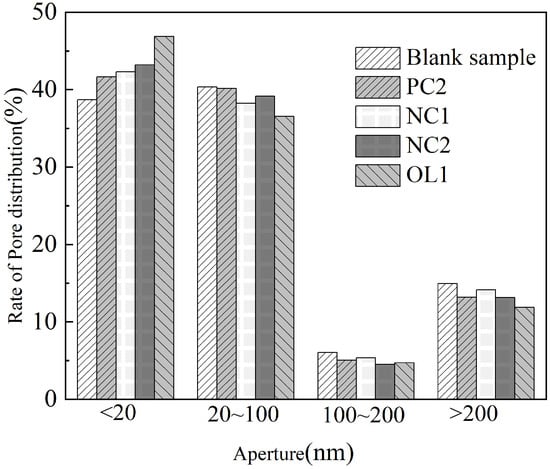 According to the division of holes by Wu Zhongwei et al. [], the rate of pore size distribution of the blank sample and test group sample is present in Figure 12. Compared with the blank sample, coating treatment increased harmless holes of the mortar matrix and increased its less harmful holes, harmful holes and multi harmful holes as well. After 7 days of coating reaction and curing, PC2, NC1, NC2 and OL1 coatings increased the harmless holes of mortar substrate surface by 7.67%, 9.36%, 11.71% and 21.23%, reduced the less harmful holes by 0.5%, 5.2%, 2.93% and 9.44%, the harmful holes by 16.86%, 11.9%, 25.95% and 22.15%, and the multi harmful holes by 11.78%, 5.42%, 12.05% and 20.54%, respectively. We can conclude that the organic–inorganic OL1 coating has the most obvious effect on the refinement of the pore structure on the surface of the mortar matrix; in particular, the dense film layer formed on the surface of the matrix could play a role in filling the harmful pores on the surface of the matrix and greatly reduce the infiltration of harmful media.