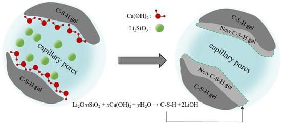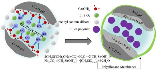 Figure 13 presents the protective mechanism of PC2 coating on cement-based materials. PC2 coating is an inorganic permeable protective coating with lithium silicate/sodium silicate composite silicate solution as the main component. The main mechanism is that the silicate component could penetrate into the matrix through the capillary pores of cement-based materials, reacting with  to produce  because the cement hydration products are easy to precipitate. The newly generated C-S-H gel would fill the original pores and improve the surface density of the matrix, while the decrease of the surface capillary diameter would impede ,  and harmful carriers such as chloride and sulfate ions entering the matrix, thus enhancing the durability of the matrix.