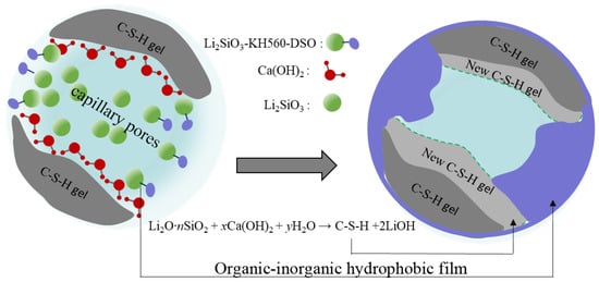 The protective mechanism of OL1 coating for cement-based materials is shown in Figure 16.  could not only react with  and generate C-S-H gel, but also could introduce organic segments into inorganic coatings by the condensation reaction of the surface hydroxyl groups and the silicon hydroxyl groups hydrolyzed by KH560 silane coupling agents. The organic hydrophobic component dimethylsilicone oil was connected to the non-hydrolyzable group of silane coupling agents through chemical bonding or physical winding, thus forming the molecular structure of -kh560-dso and becoming the main component of organic–inorganic composite coating. Its organic component dso-kh560 was polymerized by shrinkage on the surface of the substrate and its large pores, and thus a film with strong hydrophobicity was formed. After curing, the film could fill the surface pores and protect the substrate surface. On the other hand, the hydrophobicity of the coating also kept the substrate closed, which could effectively block harmful corrosive media or substances in the external environment, to improve the durability of the substrate.