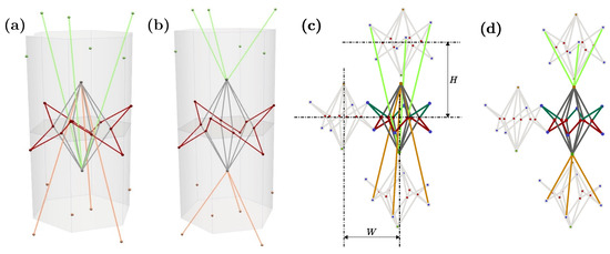 The green and orange bars in Figure 1 are responsible for changing the auxetic properties by linking to the top or bottom nodes of the neighboring unit cells (as also shown in Figure 3). The resulting Poisson’s ratio is calibrated by the position of the internal nodes. The evolving hexagonal prism, shown in light gray in Figure 1a,b, can be considered as the volume of the unit cell, with the centers of the top and bottom neighbors located at both ends of the prism. This means that, in contrast with classical metamaterials, there is no definite space dedicated only to one unit cell. In the vertical direction (Figure 1), cells are engaged in a less trivial way than in the typical metamaterial configuration, where each unit cell is typically an independent block without overlapping with its neighbors.