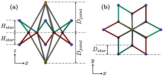 Additionally, Figure 2 shows that the height and position of the blue nodes are defined by the shape parameters of the unit cell, namely (see Figure 2b), which represents the penetration of the star within the apothem of the hexagon, and , which represents the height of the external nodes. Finally, the height of the external nodes (in orange and green in Figure 2) is defined as .
