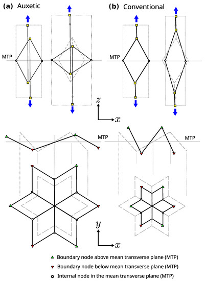 Auxetic (a) and conventional (b) lateral and top (plan) schematic views of the unit cells in different configurations.