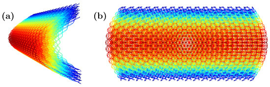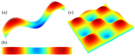 Interestingly, the proposed metamaterial cell has the same dimensions and connectivity regardless of the intended mechanical behavior. Additionally, the cell is based on a simple spatial triangularization, which allows for any curvature without significantly changing the properties. As a result, a whole metamaterial shell can be easily generated by considering the shape and size of the unit cell, the number of layers, and the desired final size of the shell. Although the geometry is not as straightforward as other cells, such as the cubic cell, it is periodic and can be implemented and computed with versatility. By stacking the unit cell, a rectangular periodic lattice is formed, which can be mapped to the desired spatial shape. In the following, a couple of examples are displayed by adding to the z-coordinate of each node a mapping function for illustration purposes (of course, more complex transformations of the nodal coordinates are possible). The example in Figure 5 is calculated by simply using: