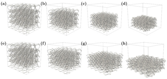 As demonstrative examples of such models, two configurations are shown here with the auxetic response in Figure 7a–d and the non-auxetic response in Figure 7e–h. The non-auxetic behavior is achieved by changing the sign of , which is equal to 0.6 mm in this case.