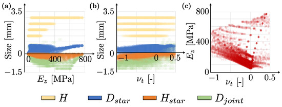 Range of mechanical properties obtained from the numerical models, considering different geometries, where (a,b) represent the magnitude (size) of these geometrical variables against the equivalent Young’s modulus and transverse Poisson’s ratio , respectively, and (c) displays the relationship between Young’s modulus and Poisson’s ratio in the simulations.