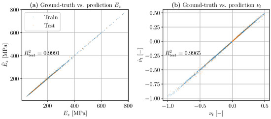The predictions of the two mechanical properties of interest in this paper (Young’s modulus and transverse Poisson’s ratio ) for the train and test sets are shown in Figure 9. In both plots, the true values are displayed on the horizontal axis, while the predictions are represented on the vertical axis, denoted by a hat decoration . The coefficient of determination is used as a metric to assess the performance of the model, and this value is also displayed in the figure.