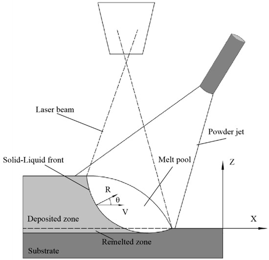 During the laser cladding process, the laser beam moves continuously and the solidification front keeps pace with the heat source, as shown in Figure 1. The macroscopic temperature distribution caused by the moving heat source is the key to determining the solidification parameters. A 3D macroscopic heat and mass transfer model is established to simulate the temperature field, velocity field and molten pool morphology. The temperature gradient G and solidification rate R along the normal line of the S/L interface are further calculated. As the interface for the solid phase grows, each point at the solidification front grows in a direction perpendicular to the S/L interface at the corresponding R rate. R = Vcosθ, where θ is the angle between the laser scanning direction and the normal solidification interface direction of the solidification interface in terms of molten pool geometry.