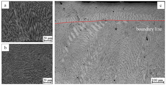 Dendrite deflection is shown in Figure 5, with Figure 5a,b showing enlarged views of regions A and B in Figure 4, respectively, and Figure 5c showing a longitudinal section. A clear boundary line for dendrite growth direction can be observed in Figure 5c, with the dendrite growth direction at the top of the deposition area above the boundary differing from that at the bottom. Dendrites at the bottom of the deposition layer were thicker columnar crystals, while the microstructure at the top was more refined and smaller in size than dendrites at the bottom of the molten pool.