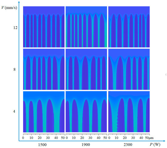 A comparison of the PDAS test and simulation results for Inconel 718 with nine process parameters is shown in Figure 7. Data comparison revealed a maximum error of 9.58% for process parameters 2300 W and 8 mm/s. Little difference is observed between PDAS values measured by simulation and experiment. The PF simulation was two-dimensional and solidification geometry may change slightly under solidification conditions in reality. However, the trend of simulation and experiment changing with scanning velocity and laser power was generally consistent, verifying model accuracy. Primary dendrite spacing decreased significantly with increasing laser scanning velocity and increased gently with increasing laser power.
