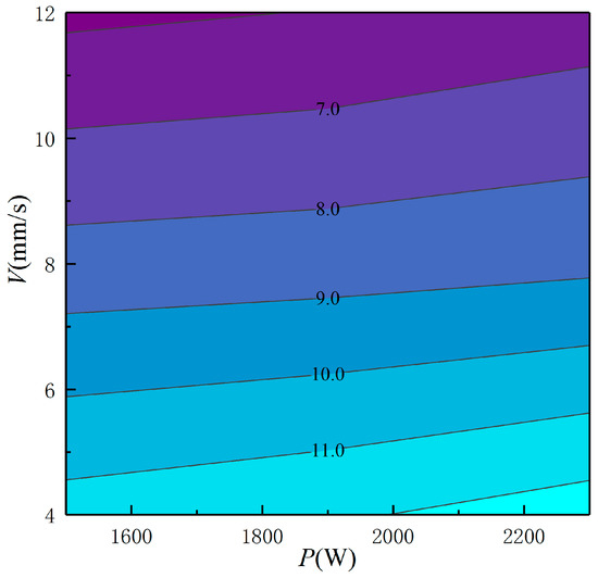 It can be seen from Figure 8 that when laser power increases from 1500 W to 2300 W at a scanning velocity of 4 mm/s, PDAS increases from 5.79 μm to 6.51 μm. Increasing laser power increased molten pool energy input and heat accumulation, decreasing the molten pool cooling rate and leading to dendrite structure coarsening.