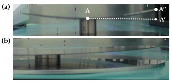 Images of wafer warpage: (a) side view; (b) magnified view of a specific region.