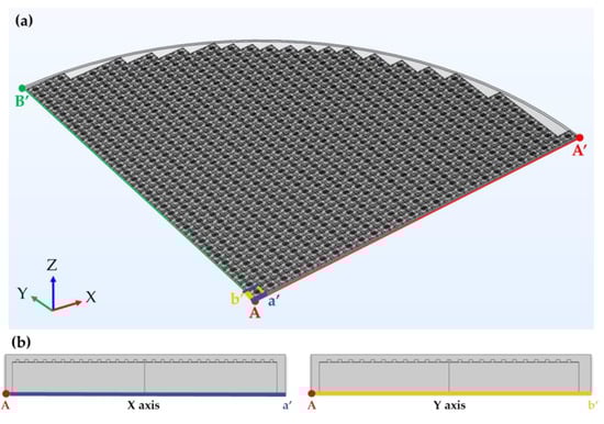 The dimensions of the 12-inch wafer and die-first packaging structure used in FOWLP are shown in Table 2. Maximum warpage was observed at the circumference of the wafer upon cooling the wafer from 180 °C to room temperature (25 °C) during the decarrier process (Figure 3). A 3D 1/4 mapping model was used to analyze the warpage in this study due to the symmetric structure of the wafer. To reduce analysis time, the 3D model was simplified into a 2D model in the X and Y axis cross-sections. Figure 4a shows the 3D 1/4 mapping model of the package and (b) shows a single unit model in the 2D X and Y axis cross-sections of the structure, which include the die, passivation layer, Cu pillar, and EMC.